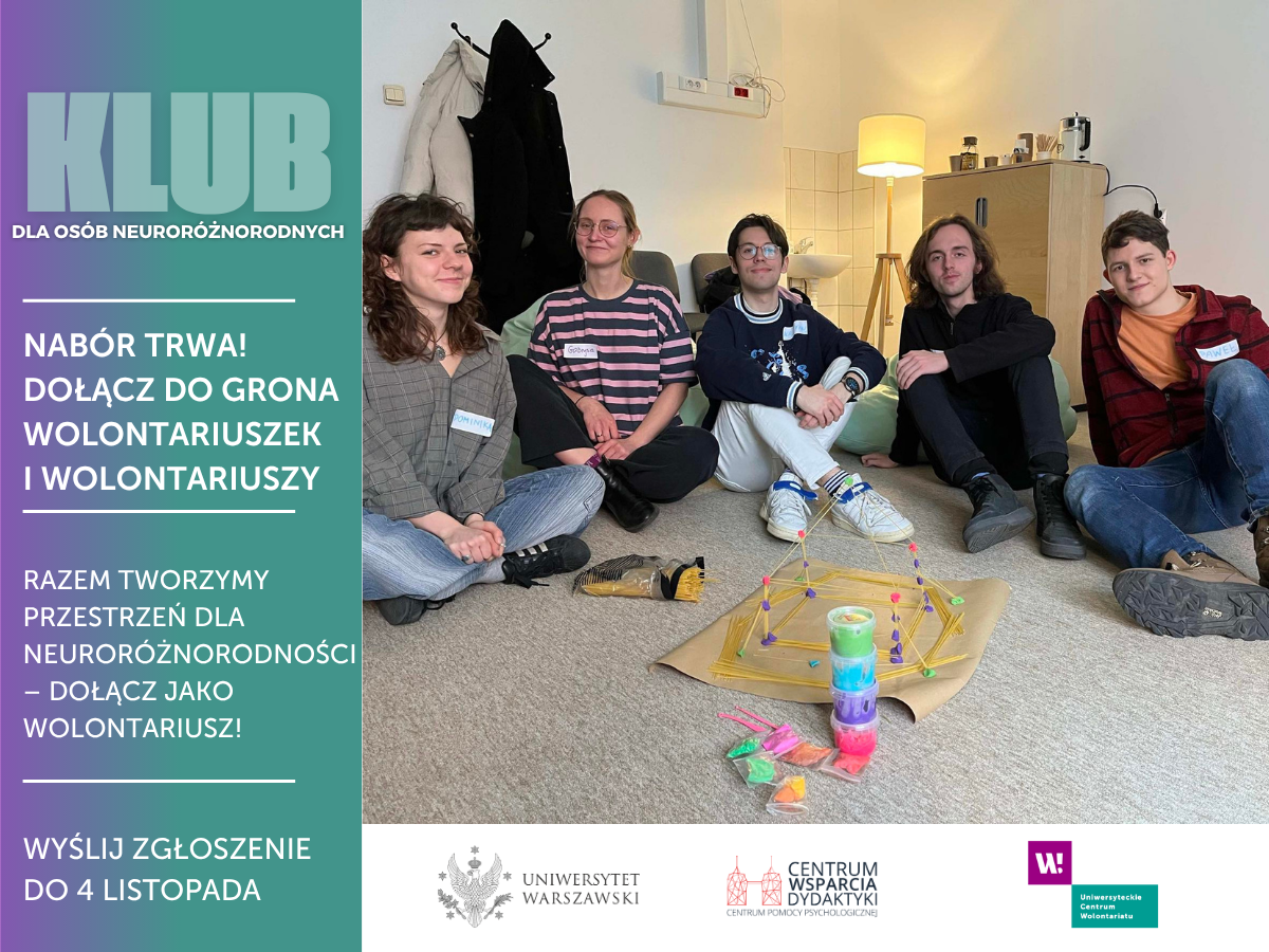 Centrum Pomocy Psychologicznej UW we współpracy z Uniwersyteckim Centrum Wolontariatu zaprasza osoby ze społeczności studenckiej – w szczególności z kierunków psychologia i pedagogika – do zaangażowania się w wolontariat w Klubie dla osób neuroróżnorodnych.
